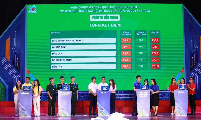 | 5 đội: Quảng Ninh, Đắk Lắk, Bến Tre, Ban Thanh niên Quân đội và Đoàn khối Doanh nghiệp Trung ương đã tham gia tranh tài dưới hình thức đối kháng trực tiếp trên sân khấu tại vòng chung kết toàn quốc cuộc thi trực tuyến tìm hiểu Nghị quyết Đại hội Đoàn toàn quốc lần thứ XII. |