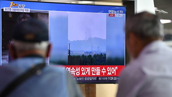 Người dân ở Seoul, Hàn Quốc, theo dõi thông tin về vụ nổ văn phòng liên lạc chung liên Triều ngày 16/6. Ảnh: AFP.
