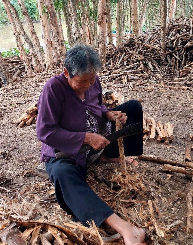 Tiếp chúng tôi trong ngôi nhà cấp 4 được hỗ trợ xây dựng đã khá lâu, bà Chính cho biết: “Trước đây, gia đình tôi rất khó khăn, ai thuê gì làm đó, dù làm “đầu tắt mặt tối” nhưng vẫn không thoát được cái nghèo. Chồng tôi là thương binh, mất đã lâu, chúng tôi có 4 người con. Hiện tại, tôi thu nhập chủ yếu từ nghề lột tràm lấy củi và sự chăm lo của người con đi làm ăn xa. Hàng tháng, tôi còn được nhận trợ cấp xã hội từ chế độ cho người cao tuổi 360.000 đồng”.