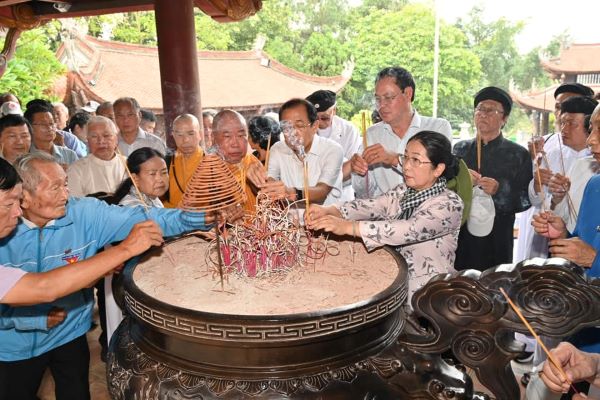 | Đoàn đại biểu TP Hồ Chí Minh dâng hương tưởng nhớ Quốc Tổ Hùng Vương. (Ảnh: Thu Duyên) |