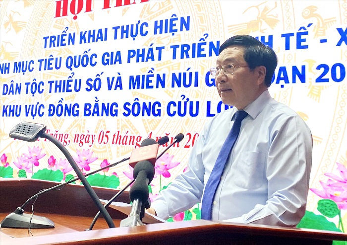 | Phó Thủ tướng Thường trực Chính phủ Phạm Bình Minh phát biểu tại Hội thảo triển khai thực hiện Chương trình mục tiêu quốc gia phát triển KT-XH vùng đồng bào DTTS và miền núi giai đoạn 2021 - 2025 khu vực Đồng bằng sông Cửu Long (Ảnh: Hải Minh) |