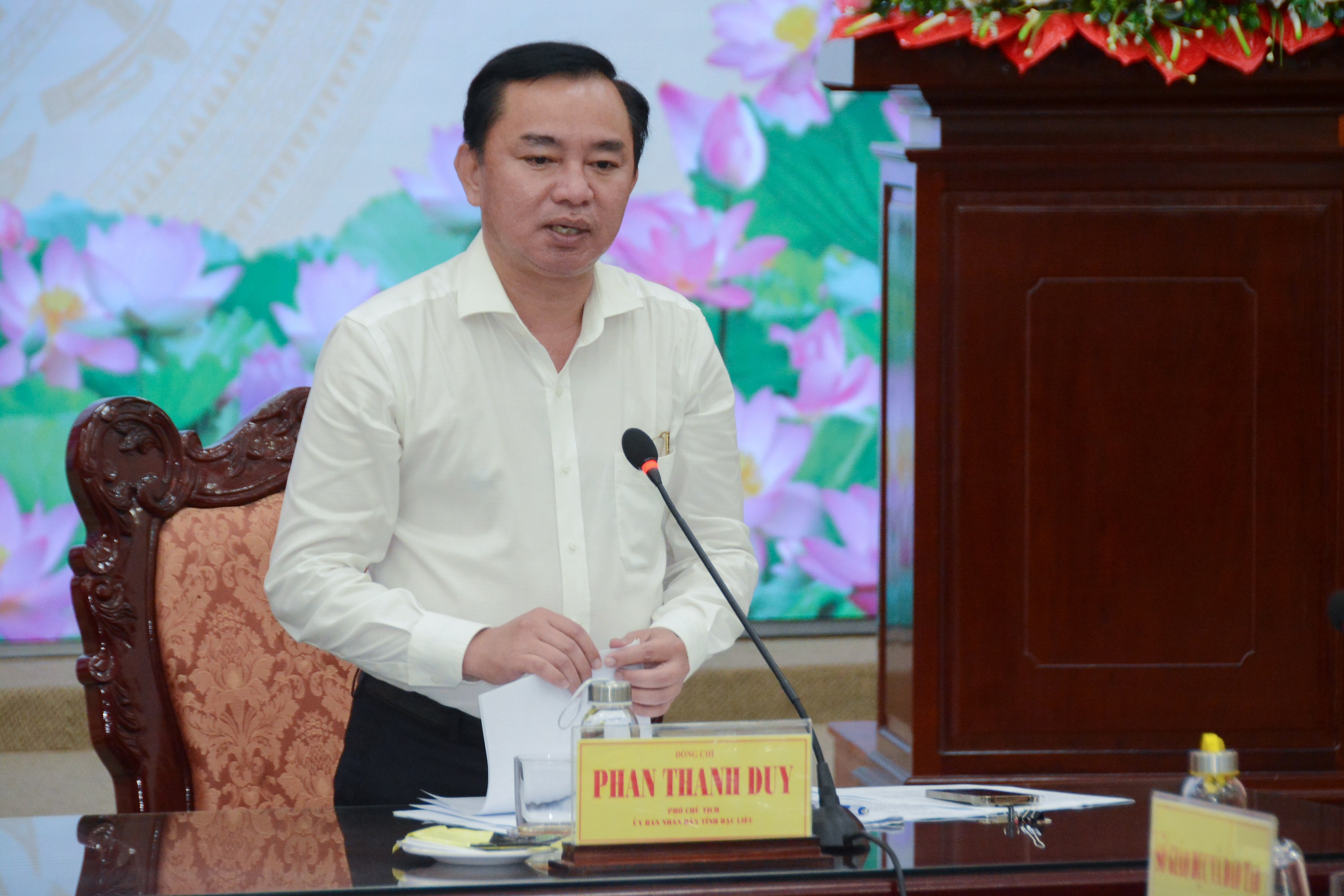 | Ông Phan Thanh Duy, Phó Chủ tịch UBND tỉnh, Trưởng Ban Chỉ đạo thi tỉnh Bạc Liêu trao đổi tại buổi làm việc. Ảnh: TT |