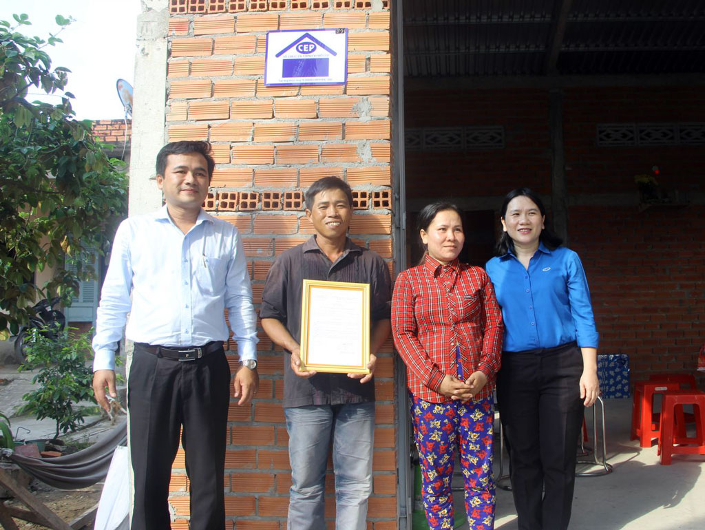 Căn nhà thứ nhất được trao cho hộ bà Nguyễn Thị Hồng Cẩm (ấp Vĩnh Xuân A, xã Dương Xuân Hội)Đến dự có Phó Tổng Giám đốc Tổ chức tài chính vi mô CEP – Phan Thị Kim Lan, Giám đốc Tổ chức tài chính vi mô CEP chi nhánh Tân An – Lê Văn Giáp, Phó Chủ tịch Liên đoàn Lao động tỉnh – Lê Thị Thu Cúc, Bí thư Huyện ủy Châu Thành – Võ Thanh Phong.