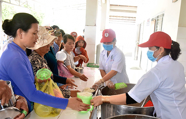 Người nhà của bệnh nhân nghèo đang điều trị tại BVĐK Trung ương Cần Thơ nhận những suất cơm nghĩa tình từ tay các TNV.