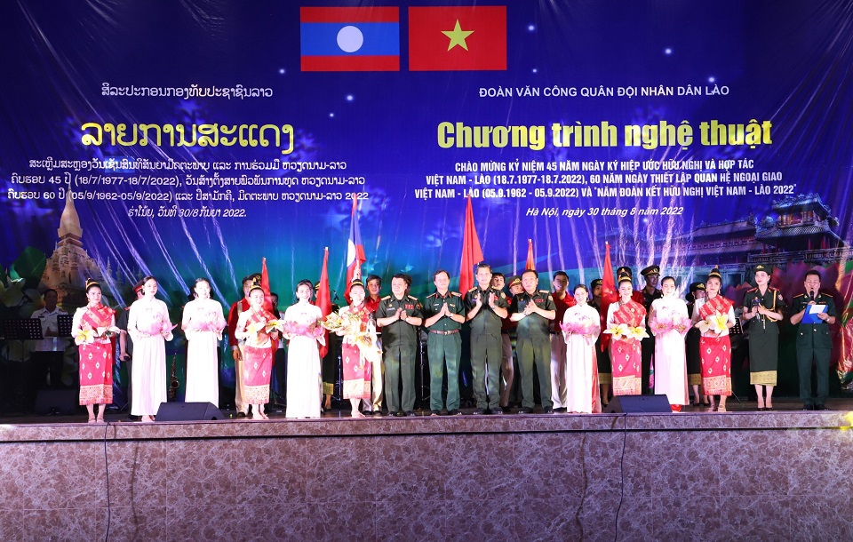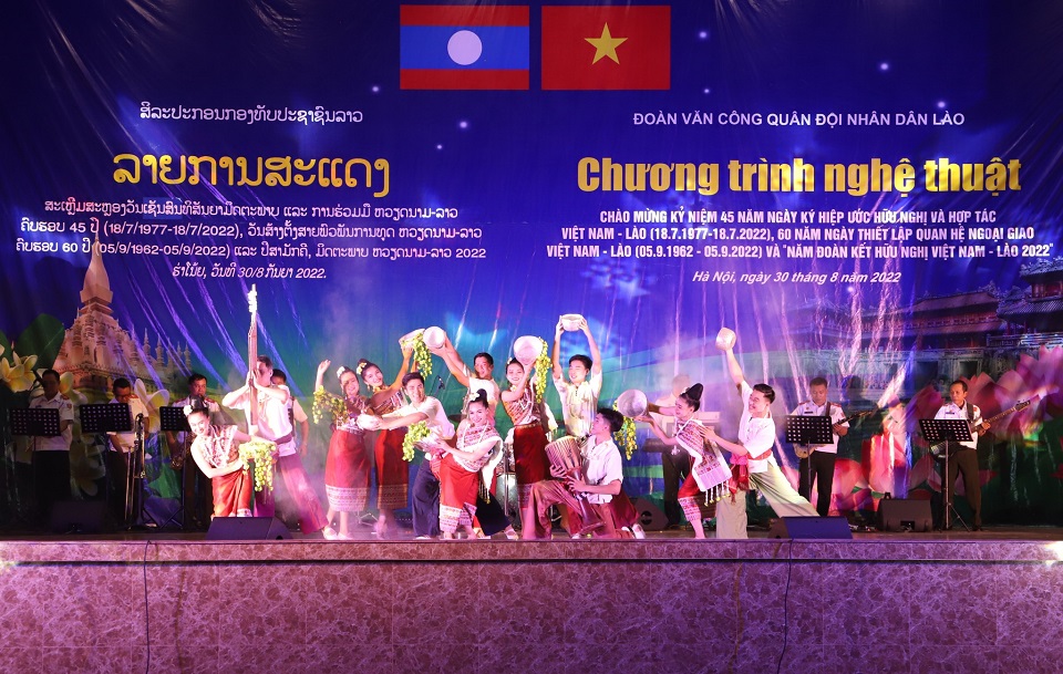 Tối ngày 30/8/2022, tại Trường Sĩ quan Chính trị (Bộ Quốc phòng) đã diễn ra Chương trình nghệ thuật với sự tham gia biểu diễn của các nghệ sĩ, diễn viên và ca sĩ Đoàn văn công Quân đội nhân dân Lào. Chương trình nằm trong chuỗi các sự kiện chào mừng kỷ niệm 45 năm Ngày ký Hiệp ước Hữu nghị và Hợp tác Việt Nam - Lào (18/7/1977 - 18/7/2022), 60 năm Ngày thiết lập quan hệ ngoại giao (05/9/1962 - 05/9/2022) và “Năm Đoàn kết hữu nghị Việt Nam - Lào 2022".