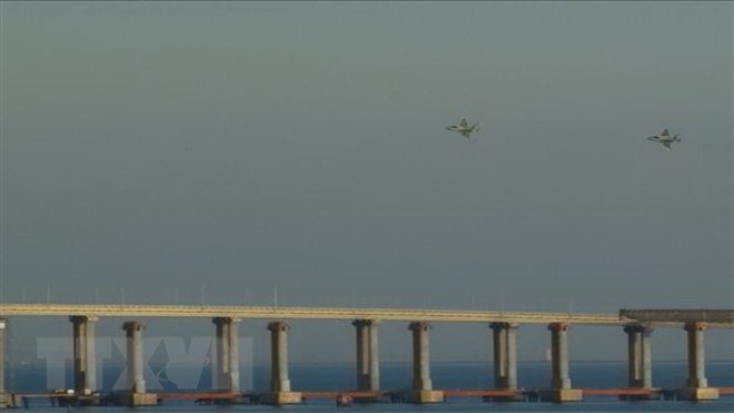 Máy bay Nga bay qua cầu Crimea trên Eo biển Kerch (nối giữa biển Azov và Biển Đen), nơi xảy ra vụ va chạm giữa tàu tuần dương Nga và tàu hải quân Ukraine ngày 25/11/2018. (Ảnh: AFP/TTXVN)
