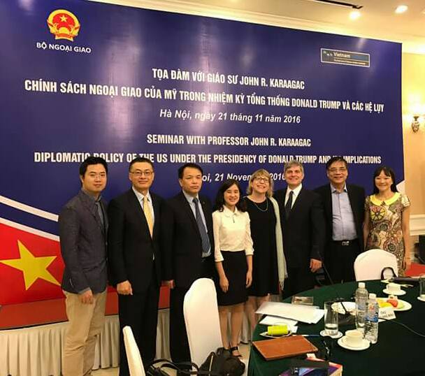 Các đại biểu tham dự Tọa đàm đã có cơ hội lắng nghe, trao đổi, thảo luận với Giáo sư John R. Karaagac về cuộc bầu cử Tổng thống của Mỹ với thắng lợi thuộc về ông Donald Trump, chính sách ngoại giao của Mỹ trong nhiệm kỳ Tổng thống Donald Trump và dự báo các tác động của chính sách này đến kinh tế Mỹ, kinh tế thế giới, quá trình toàn cầu hoá, các hiệp định về biến đổi khí hậu, chính sách tiền tệ của Mỹ, sự điều chính sách của Mỹ đối với Trung Quốc, Nga, Nhật Bản, khu vực châu Á – Thái Bình Dương cũng như khả năng Hiệp định đối tác xuyên Thái Bình Dương (TPP) được thông qua.