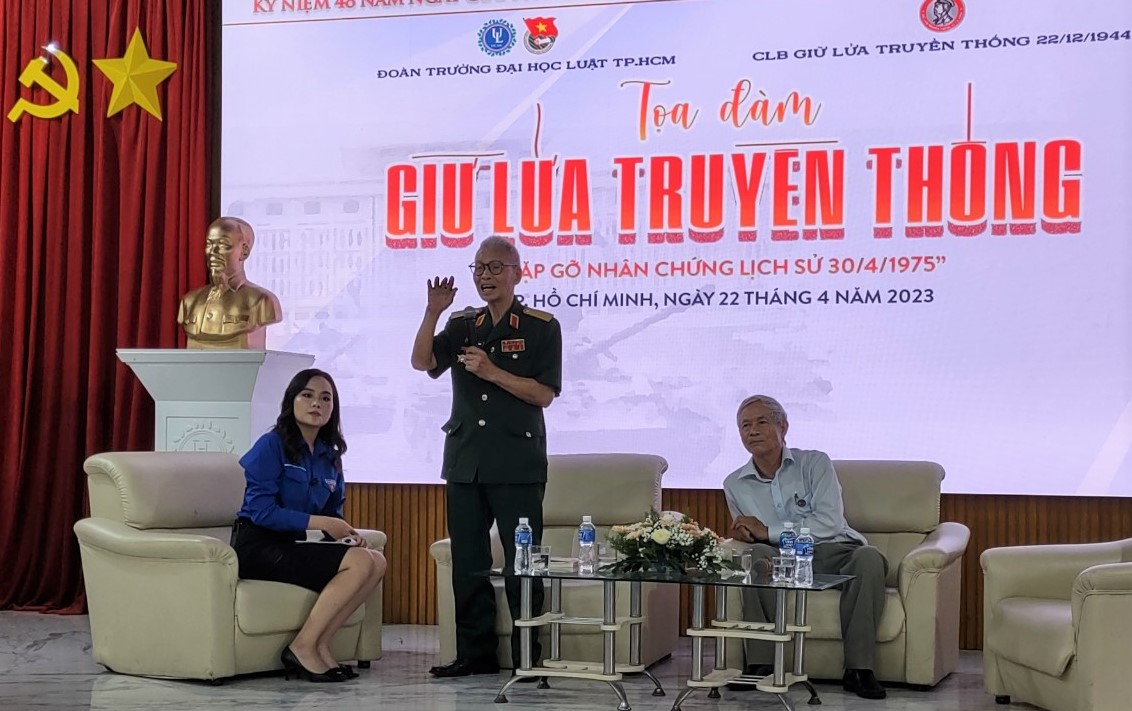 (ĐCSVN) - Nhân kỷ niệm 48 năm Ngày giải phóng miền Nam, thống nhất đất nước (30/4/1975 – 30/4/2023), ngày 22/4, tại TP Hồ Chí Minh, CLB Giữ lửa truyền thống ngày thành lập quân đội nhân dân Việt Nam 22/12/1944 phối hợp với trường Đại học Luật TP Hồ Chí Minh tổ chức Tọa đàm “giữ lửa truyền thống”, gặp gỡ nhân chứng lịch sử tham gia chiến dịch Hồ Chí Minh – chiến dịch giải phóng Sài Gòn – Gia định với đông đảo các em sinh viên ngành Luật.