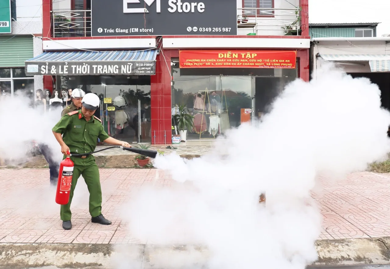 Diễn tập phòng cháy, chữa cháy cho người dân ở Tổ liên gia phòng cháy, chữa cháy tại thị trấn Bến Lức, huyện Bến Lức