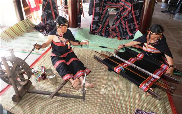Trình diễn quay sợi, dệt thổ cẩm của dân tộc Giẻ Triêng tỉnh Kon Tum (Ảnh: Hồ Cầu/TTXVN)