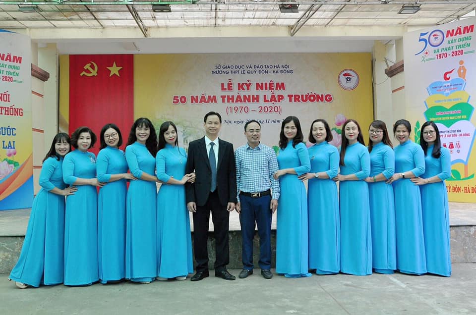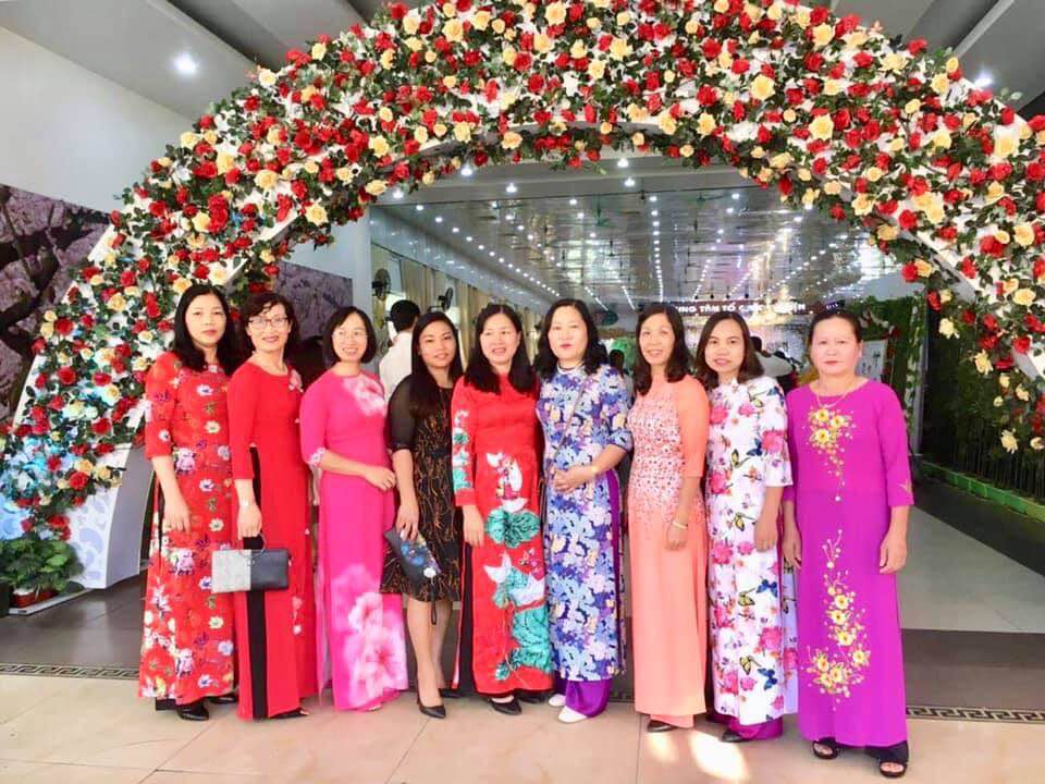 | Niềm vui của cô giáo Phạm Hà Thanh (thứ tư, phải sang) cùng các nữ đồng nghiệp trong trang phục áo dài truyền thống. |