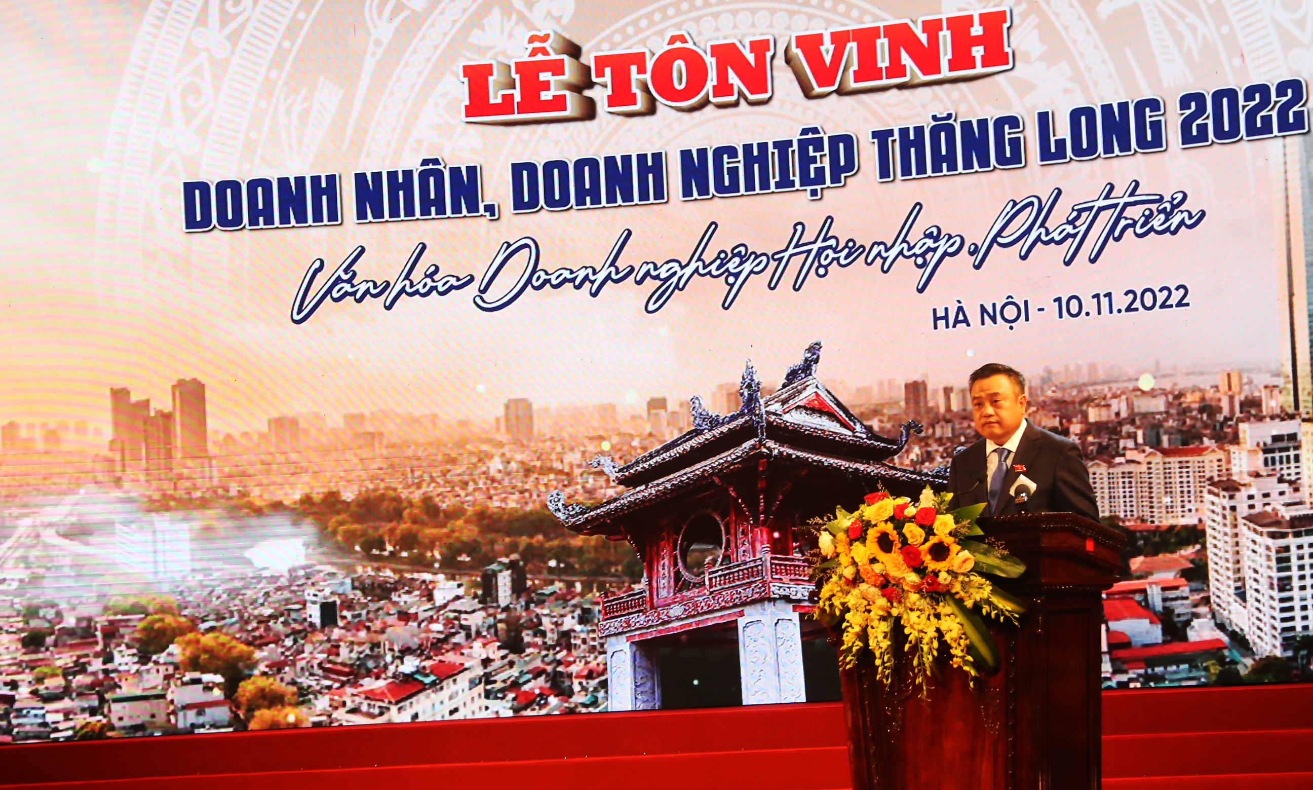 Phát biểu tại lễ tôn vinh, Chủ tịch UBND TP Hà Nội Trần Sỹ Thanh cho biết, năm 2022 có thể nói là năm hết sức khó khăn, tình hình thế giới có nhiều biến động nhanh, phức tạp, chưa có tiền lệ và khó đoán định, đã ảnh hưởng đến quá trình phục hồi kinh tế của Việt Nam nói chung, Thủ đô Hà Nội nói riêng. Tuy nhiên, với quyết tâm, sự vào cuộc của cả hệ thống chính trị thành phố, sự chia sẻ, đồng hành của cộng đồng doanh nghiệp và nhân dân Thủ đô, thành phố Hà Nội đã đạt được những kết quả tích cực, toàn diện trên các lĩnh vực. Chín tháng đầu năm 2022, kinh tế Thủ đô phục hồi mạnh mẽ; tăng trưởng quý 3 tăng 15,71%, lũy kế 9 tháng tăng 9,69% - là mức tăng cao nhất trong nhiều năm trở lại đây.