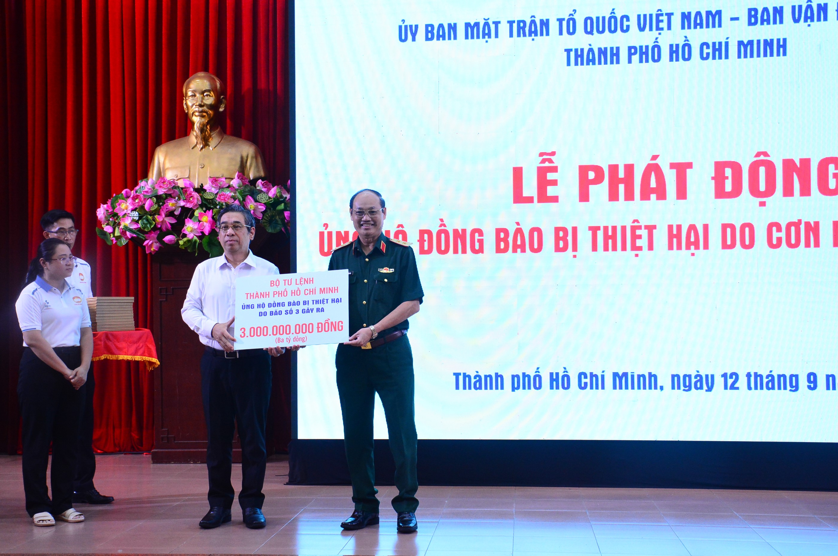 | Đồng chí Nguyễn Phước Lộc, Chủ tịch Ủy ban MTTQ Việt Nam TP Hồ Chí Minh tiếp nhận bảng tượng trưng từ Bộ Tư lệnh TP Hồ Chí Minh ủng hộ đồng bào bị thiệt hại do bão số 3. (Ảnh: Hoàng Mẫn) |