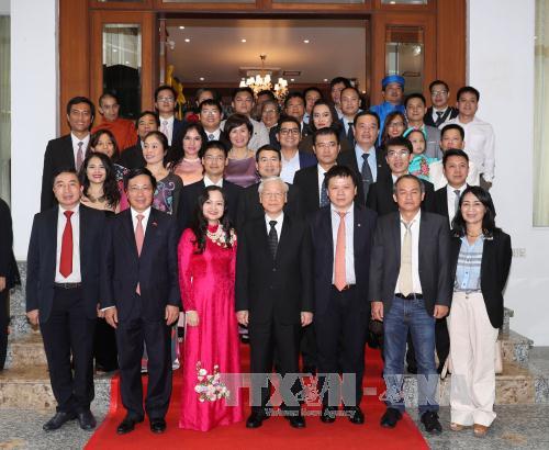 Tổng Bí thư Nguyễn Phú Trọng chụp ảnh chung với cán bộ, nhân viên Đại sứ quán, đại diện cộng đồng, lưu học sinh và doanh nghiệp Việt Nam. Ảnh: Trí Dũng - TTXVN