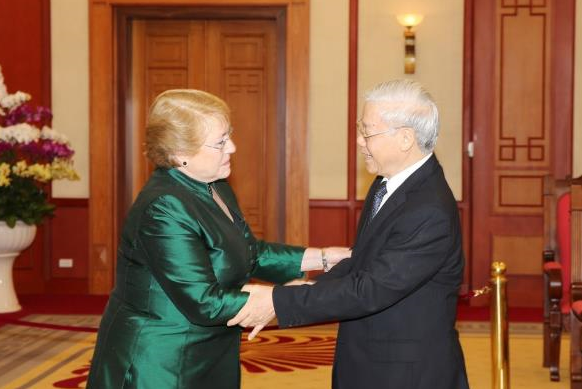 Tổng Bí thư Nguyễn Phú Trọng nhiệt liệt hoan nghênh Tổng thống Mi-chen Ba-chê-lê thăm lại Việt Nam; cảm ơn sự giúp đỡ to lớn, vô tư, trong sáng mà các chính đảng cánh tả, tiến bộ và nhân dân Chi-lê anh em đã dành cho nhân dân Việt Nam trong thời kỳ đấu tranh giải phóng dân tộc, thống nhất đất nước trước đây, cũng như trong công cuộc xây dựng và bảo vệ Tổ quốc hiện nay; đánh giá cao sự ủng hộ, giúp đỡ quí báu, hiệu quả của cá nhân bà Tổng thống đã dành cho Việt Nam và cho quan hệ giữa hai nước Việt Nam – Chi-lê.