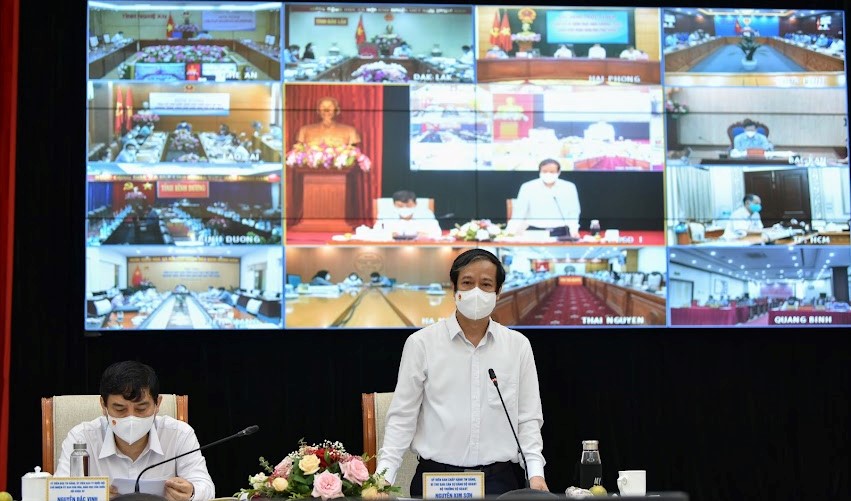 | Bộ trưởng Bộ GD&ĐT Nguyễn Kim Sơn phát biểu tại Hội nghị trực tuyến. (Ảnh: Thế Đại) |