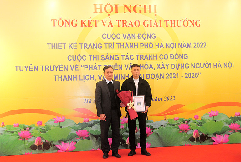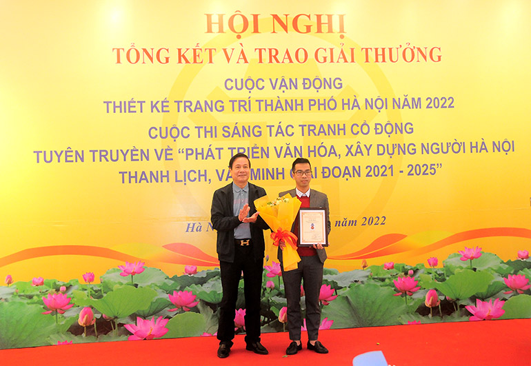 | Đại diện Ban tổ chức trao giải Nhất cho tác giả có tác phẩm đoạt giải Nhất cuộc thi Cuộc vận động thiết kế trang trí thành phố Hà Nội năm 2022. |