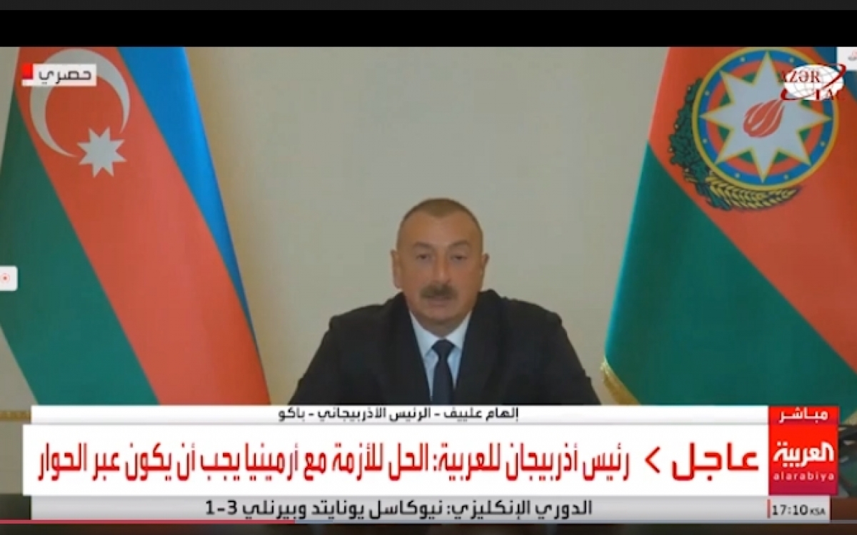 Tổng thống Azerbaijan Ilham Aliyev trả lời phỏng vấn của kênh truyền hình Al Arabiya vào đầu tháng 10, về vấn đề xung đột Nagorno-Karabakh. (Nguồn ảnh: Al Arabiya/Azertag)