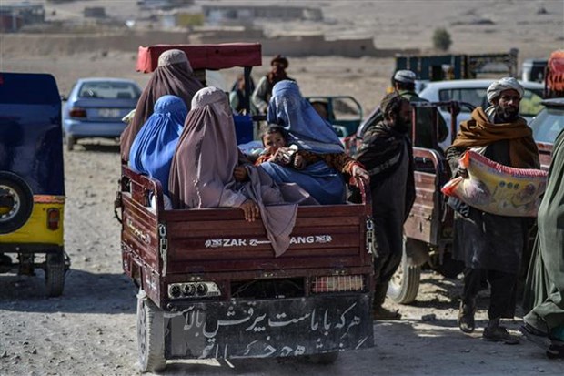 Người dân nhận thực phẩm cứu trợ của Hội chữ thập Đỏ ở Kandahar, Afghanistan. (Ảnh: AFP/TTXVN)