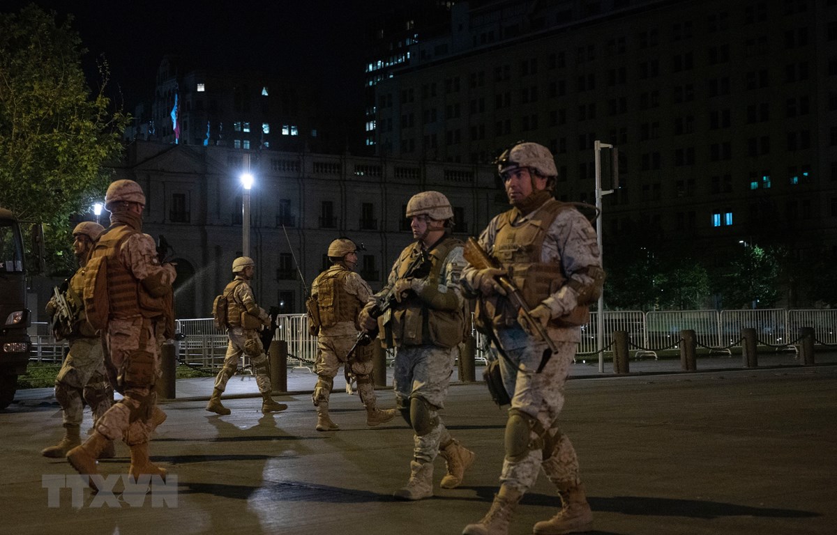 Binh sỹ Chile tuần tra trên đường phố ở thủ đô Santiago khi lệnh giới nghiêm được áp đặt nhằm ngăn chặn bạo lực, tối 21/10/2019. (Ảnh: AFP/TTXVN)