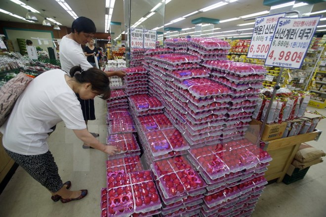 Trứng được bày bán tại một siêu thị ở Seoul, Hàn Quốc ngày 15/8. (Nguồn: EPA/TTXVN)