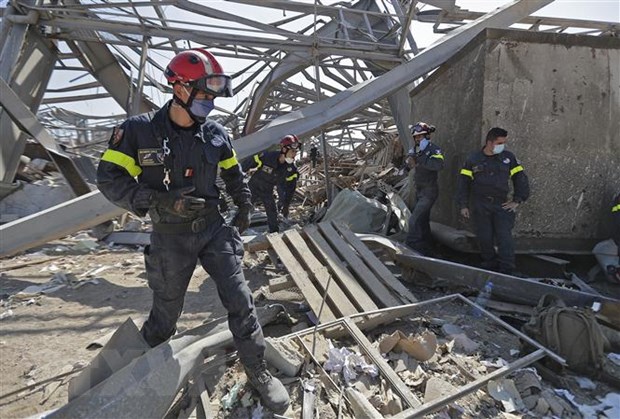 Nhân viên cứu hộ đến từ Pháp tìm kiếm nạn nhân dưới đống đổ nát sau vụ nổ ở Beirut, Liban, ngày 7/8/2020. (Ảnh: AFP/TTXVN)