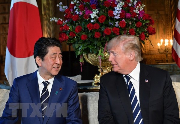 Tổng thống Donald Trump (phải) và Thủ tướng Shinzo Abe (trái) trong cuộc gặp tại Palm Beach, Florida, Mỹ ngày 17/4. (Nguồn: AFP/TTXVN)