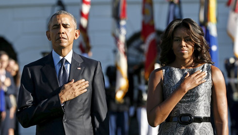 Tổng thống Obama và phu nhân dành 1 phút mặc niệm những nạn nhân vụ khủng bố 11/9 vào năm ngoái. Ảnh: Reuters.