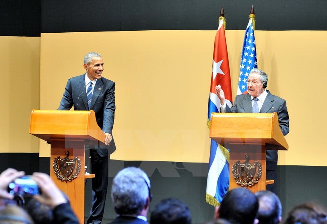 Chủ tịch Cuba Raúl Castro và Tổng thống Mỹ Barack Obama trong buổi tuyên bố với báo chí sau hội đàm. (Ảnh: Hoài Nam/TTXVN)
