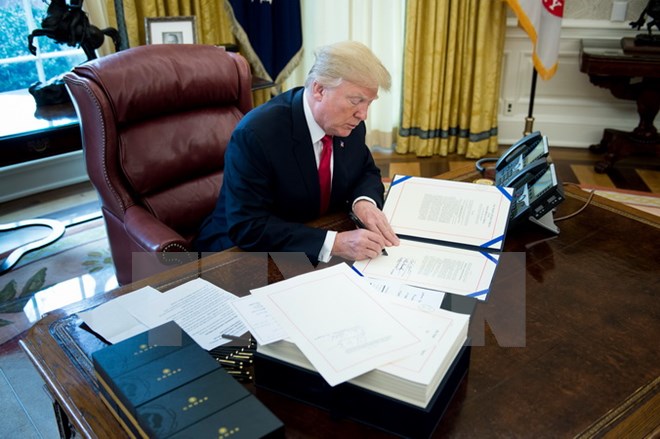 Tổng thống Mỹ Donald Trump ký một văn bản ở Washington DC., ngày 22/12/2017. (Ảnh: AFP/TTXVN)