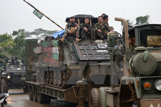 Binh sĩ Philippines tuần tra tại thành phố Marawi , đảo Mindanao. (Nguồn: AFP/TTXVN)