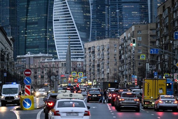Quang cảnh bên ngoài tòa cao ốc Trung tâm thương mại quốc tế Moskva ở thủ đô Moskva (Nga) ngày 25/4/2022. (Ảnh: AFP/TTXVN)
