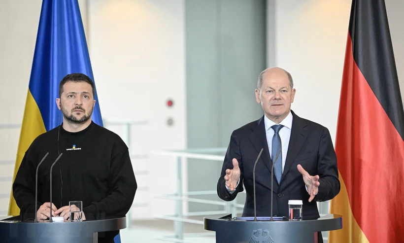 Thủ tướng Đức Olaf Scholz (phải) trong cuộc họp báo chung với Tổng thống Ukraine Volodymyr Zelensky tại Berlin, ngày 14/5/2023. (Ảnh: AFP/TTXVN)