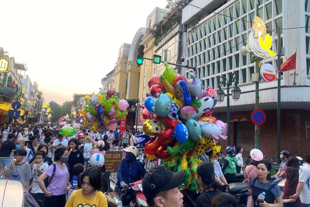 | Không gian đi bộ hồ Hoàn Kiếm chật cứng du khách vào dịp nghỉ Lễ. (Ảnh: HL) |
