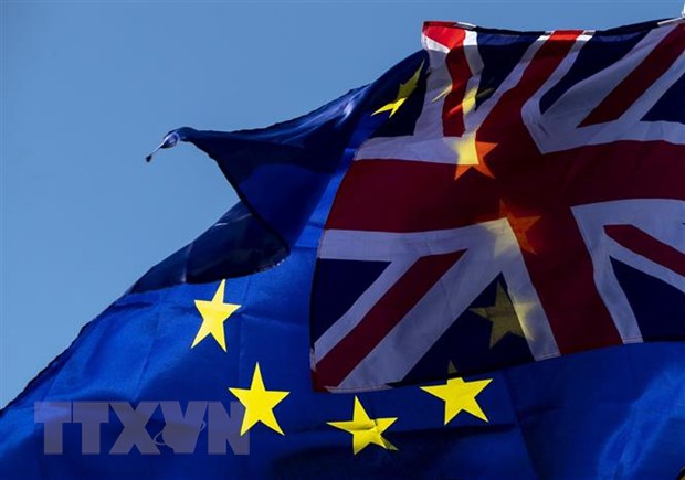 Cờ Anh (phía trước) và cờ EU (phía sau) bên ngoài tòa nhà Quốc hội Anh ở London. (Ảnh: THX/TTXVN)