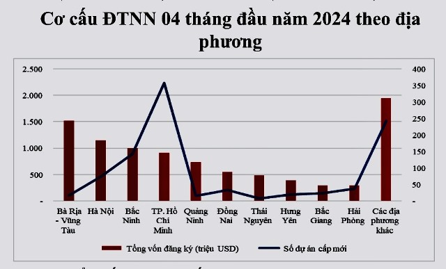 Cũng theo Cục ĐTNN, tháng 4/2024 ghi nhận lượng vốn đầu tư mới và giá trị các giao dịch GVMCP cao hơn các tháng đầu năm 2024, số dự án đầu tư mới cũng đạt mức cao nhất kể từ đầu năm. Mức tăng tổng vốn đầu tư đăng ký so với cùng kỳ năm 2024 đạt 4,5%. Vốn đầu tư tập trung nhiều vào các tỉnh, thành phố có nhiều lợi thế trong thu hút ĐTNN (cơ sở hạ tầng tốt, nguồn nhân lực ổn định, nỗ lực cải cách thủ tục hành chính và năng động trong công tác xúc tiến đầu tư,…) như Hà Nội, Bắc Ninh, Quảng Ninh, Thái Nguyên, TP Hồ Chí Minh, Đồng Nai, Bà Rịa - Vũng Tàu, Hưng Yên, Bắc Giang, Hải Phòng. Riêng 10 địa phương này đã chiếm 74,8% số dự án mới và 79,1% số vốn đầu tư của cả nước trong 4 tháng. Các đối tác đầu tư lớn nhất trong 04 tháng đầu năm đều là các đối tác truyền thống của Việt Nam và đến từ châu Á. Riêng 5 quốc gia và vùng lãnh thổ dẫn đầu (Singapore, Hồng Kông (Trung Quốc), Trung Quốc, Nhật Bản, Hàn Quốc) đã chiếm tới 73,1% số dự án đầu tư mới và 73,4% tổng vốn đầu tư đăng ký của cả nước.