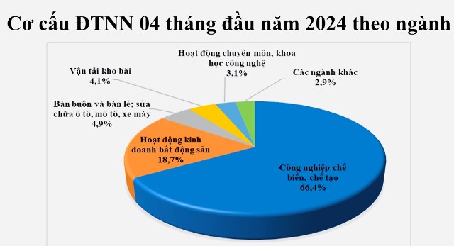 Các nhà đầu tư nước ngoài đã đầu tư vào 17 ngành trong tổng số 21 ngành kinh tế quốc dân. Trong đó, ngành công nghiệp chế biến, chế tạo dẫn đầu với tổng vốn đầu tư đạt hơn 6,15 tỷ USD, chiếm gần 66,4% tổng vốn đầu tư đăng ký, tăng 19,8% so với cùng kỳ. Ngành kinh doanh bất động sản đứng thứ 2 với tổng vốn đầu tư hơn 1,73 tỷ USD, chiếm gần 18,7% tổng vốn đầu tư đăng ký, tăng 78,2% so với cùng kỳ. Tiếp theo lần lượt là các ngành bán buôn bán lẻ; vận tải kho bãi với tổng vốn đăng ký đạt lần lượt hơn 451,4 triệu USD và gần 383,2 triệu USD. Còn lại là các ngành khác.