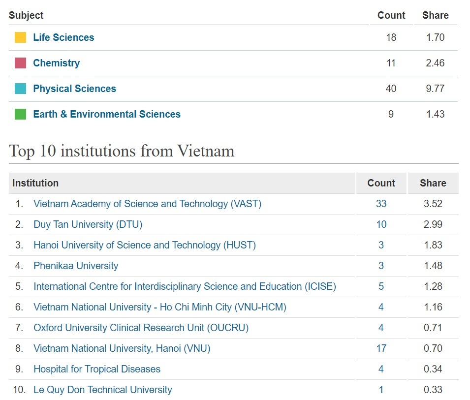 Theo Bảng xếp hạng Nature Index, top 10 cơ sở nghiên cứu hàng đầu của Việt Nam như sau:
