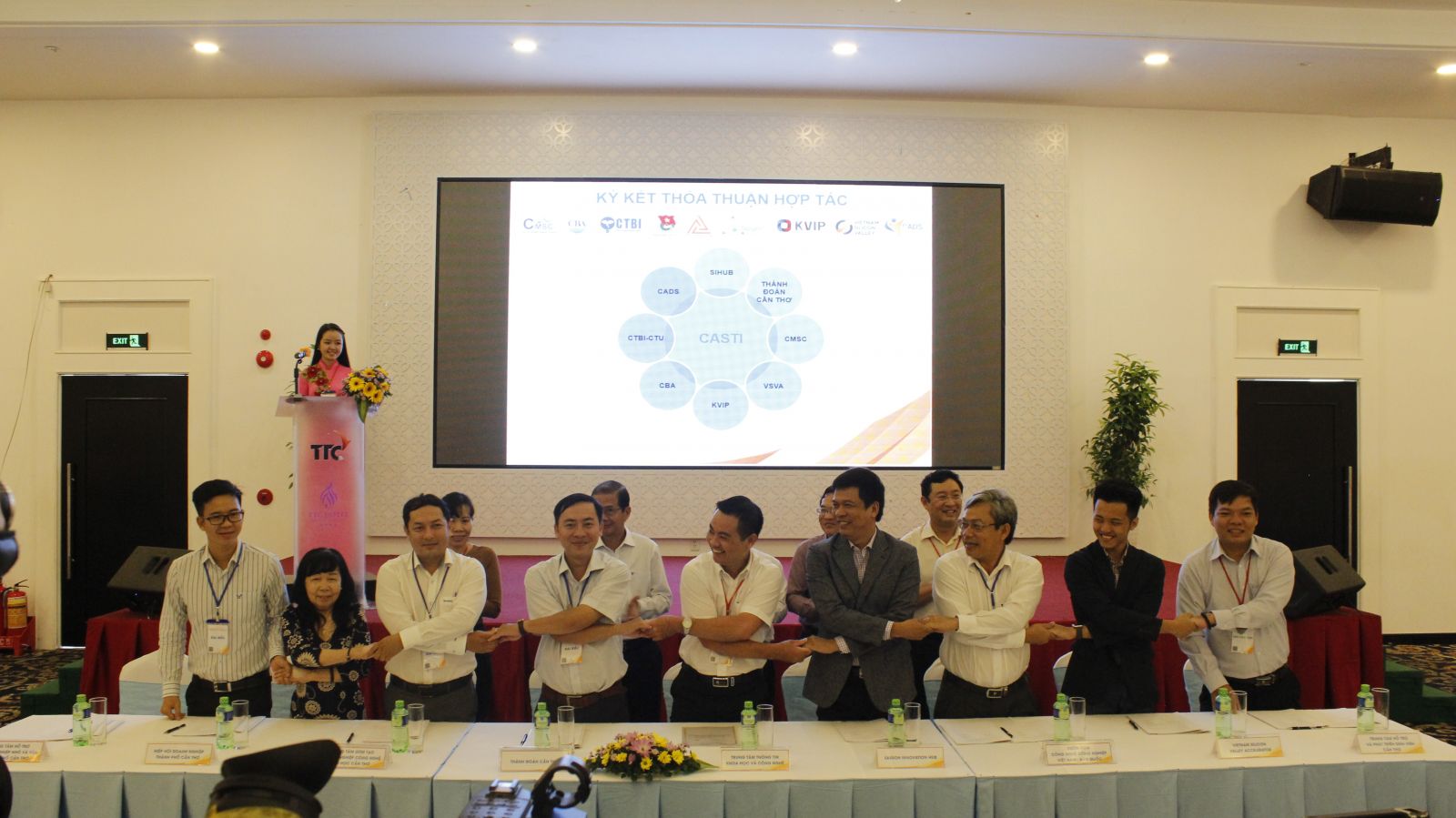 Các đại biểu ký kết thỏa thuận hợp tác hỗ trợ hoạt động khởi nghiệp đổi mới sáng tạo tại TP Cần Thơ trong một Hội thảo về thúc đẩy khởi nghiệp đổi mới sáng tạo do Sở KH&CN TP Cần Thơ tổ chức vào tháng 6-2018.