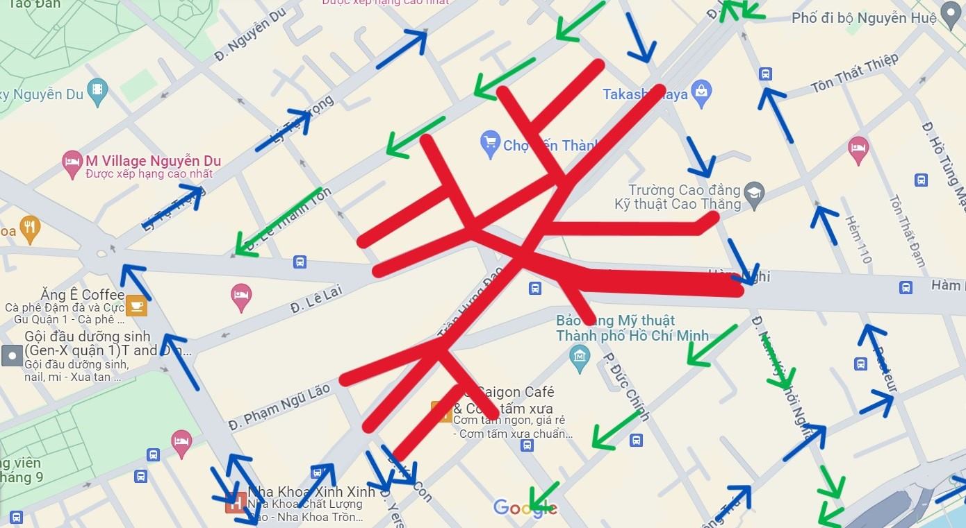| Phạm vi cấm lưu thông (mũi tên màu đỏ) và hướng lưu thông thay thế (mũi tên 2 màu xanh). Ảnh: Sở GTVT TP.HCM |