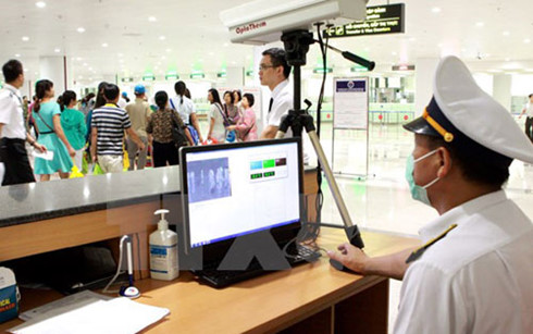 Kiểm tra nhiệt độ hành khách bằng máy đo thân nhiệt tia hồng ngoại (Ảnh: TTXVN)
