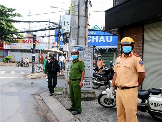 Chốt kiểm soát linh hoạt của Công an quận Gò Vấp, Thành phố Hồ Chí Minh. (Ảnh: Thành Chung/TTXVN)