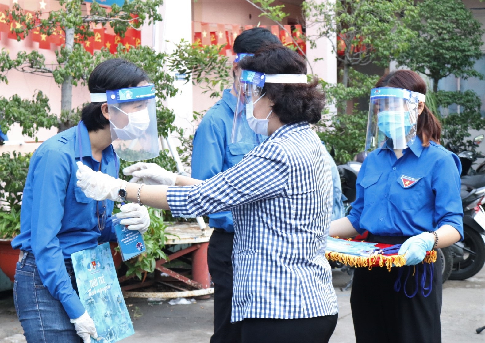 | Tặng tấm chắn giọt bắn và thẻ tình nguyện cho thanh niên tham gia đội hình tình nguyện. |