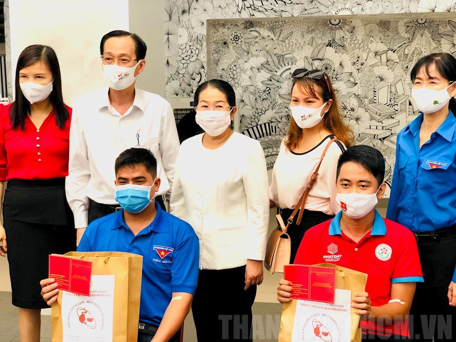 | Phó Bí thư Thành ủy TP Võ Thị Dung và Phó Chủ tịch Thường trực UBND TP Lê Thanh Liêm trao quà và động viên người tham gia hiến máu tình nguyện (Ảnh: Web Thành ủy TP.HCM) |