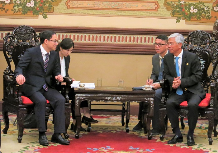 | Phó Chủ tịch UBND TPHồ Chí Minh Võ Văn Hoan (bên phải) tiếp ông Lại Chí Hồng, Phó Thị trưởng thành phố Quảng Châu, Trung Quốc. (Ảnh: Minh Thư) |
