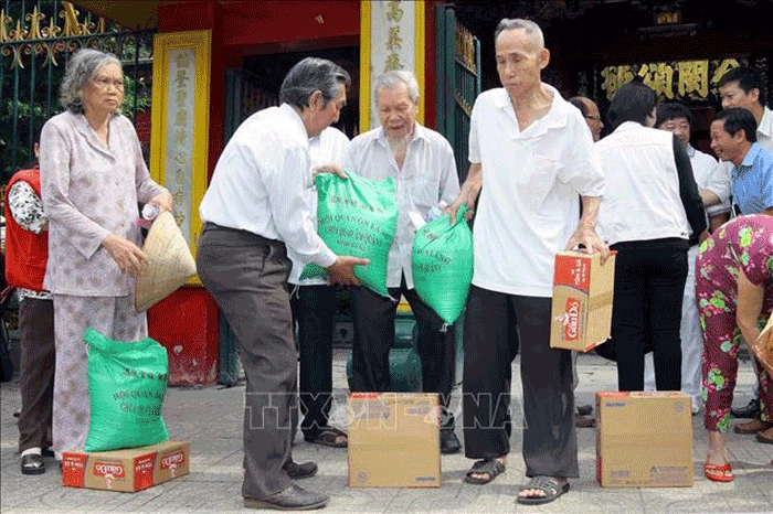 Hội quán Ôn Lăng (của cộng đồng người Hoa) cùng Hội Chữ thập đỏ Quận 5 tặng quà định kỳ giúp hộ nghèo, người già neo đơn, đóng góp một phần tích cực trong chương trình xóa đói giảm nghèo của địa phương. Ảnh tư liệu: Thanh Vũ (TTXVN)