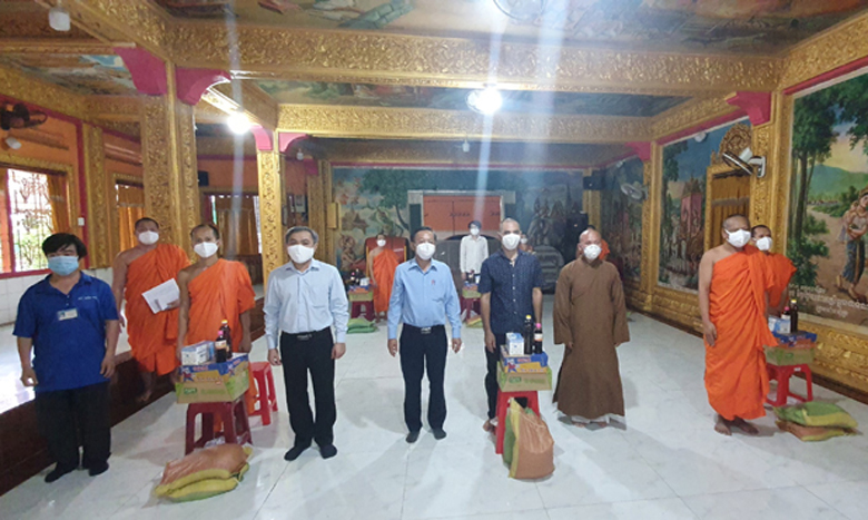 | Đại diện Ban Dân vận Thành ủy và Ban Dân tộc Thành phố Hồ Chí Minh tặng quà cho Chùa Khmer tại quận 3 (ảnh: Ban Dân tộc Thành phố Hồ Chí Minh) |