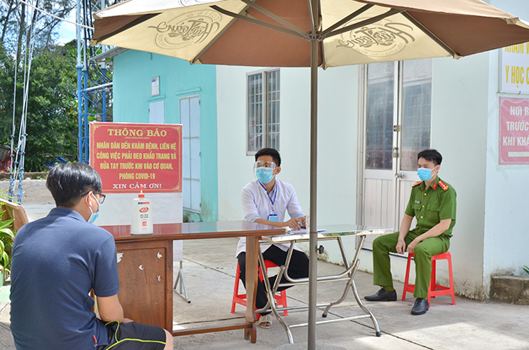 Nhân viên y tế Trạm Y tế phường Vĩnh Bảo (TP. Rạch Giá) phối hợp công an phường tiếp nhận khai báo y tế của người dân.