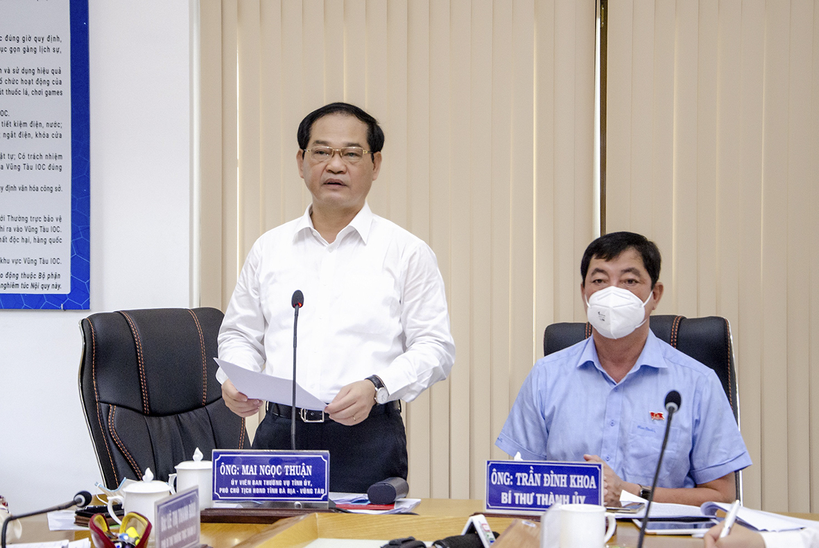 Đồng chí Mai Ngọc Thuận, Ủy viên Ban Thường vụ Tỉnh ủy, Phó Chủ tịch HĐND tỉnh Bà Rịa- Vũng Tàu; đồng chí Trần Đình Khoa, Ủy viên Ban Thường vụ Tỉnh ủy, Bí thư Thành ủy Vũng Tàu, chủ trì cuộc họp.