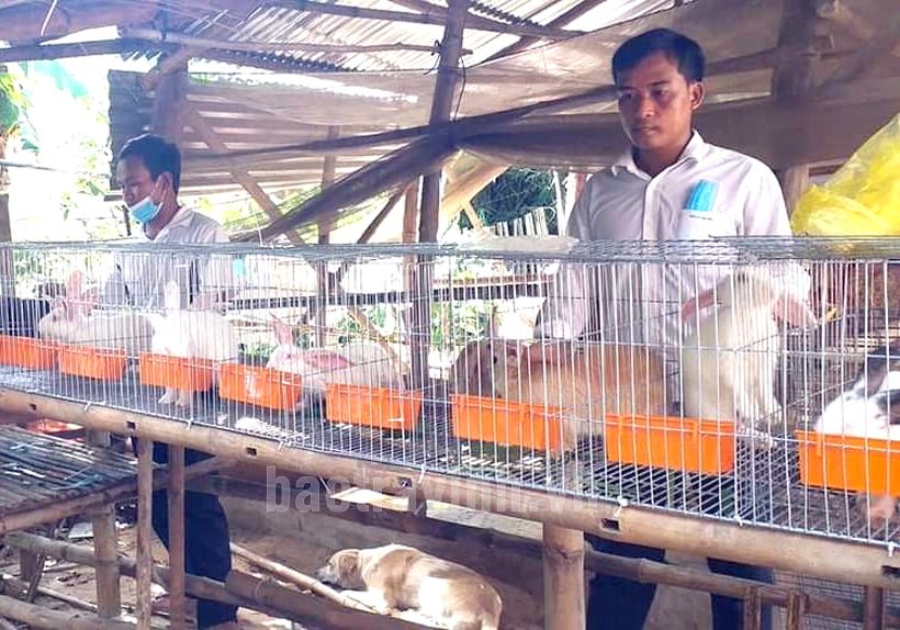 Mô hình nuôi thỏ sinh sản của gia đình chị Kim Thị Hành từ nguồn vốn vận động của Xã Đoàn Long Hiệp. Ảnh: PH